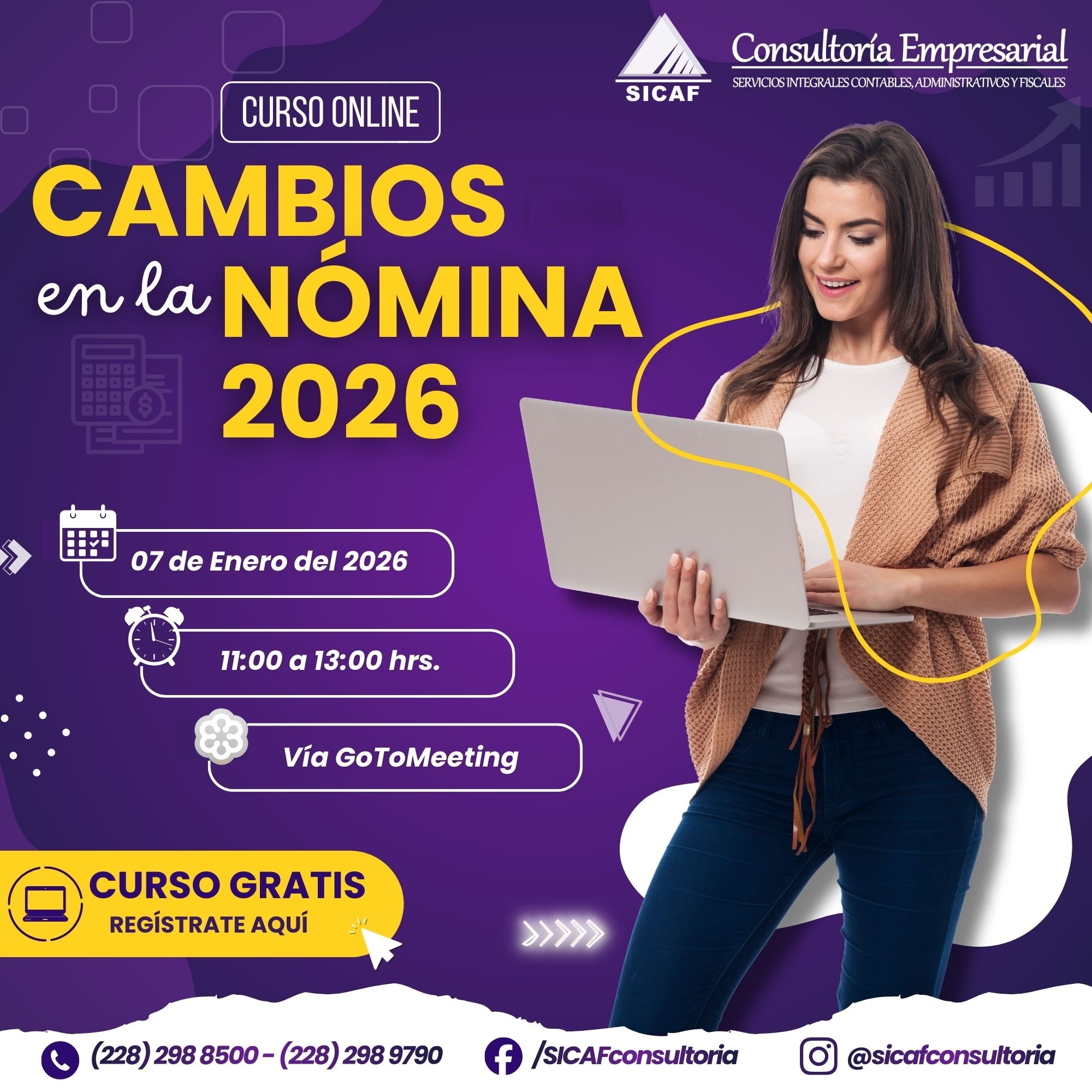 Expositor: L.C. Fabián Aguilar Sede: En Línea Horarios: 11:00 a 13:00 hrs Registro Informes: Teléfonos: 228 2988500 - 228 2989790 Celular: 228 1461137 - 228 3074180 Correo electrónico: cursos@sicafconsultoria.com Página Web www.sicafconsultoria.com
